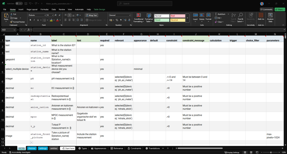 ODK forms are created using spreadsheets (e.g., Excel or Google Sheets) following the XLSForm standard. The process is intuitive, as users can easily add ODK form fields in a table, where they can define associated survey questions, answer restrictions, linked questions, data types, and more.