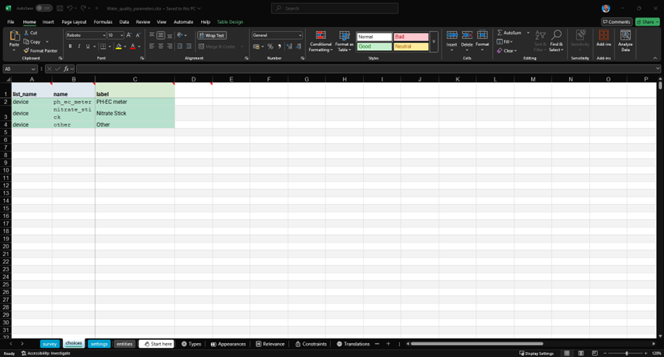 The ‘choices’ sheet includes details about multiple-choice questions. In our example, it refers to the fourth form element in Table 1 (row 5). This question allows for multiple selections of choices with the ‘device’ label from the ‘choices’ sheet.